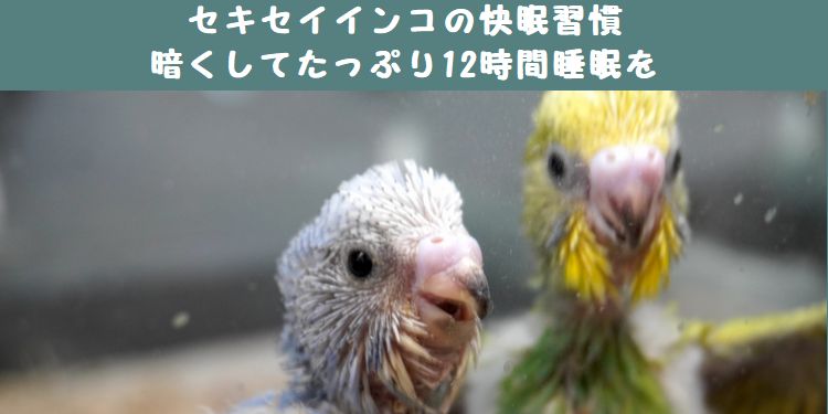 飼育下では、セキセイインコの理想的な睡眠時間は10〜12時間程度ですが、健康維持のためには12時間以上確保するのが望ましいとされています。野生では日の入りから日の出まで、12〜16時間眠り続けると言われています。