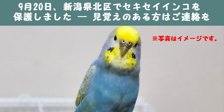 2025年9月20日、新潟県北区で黄色い頭部、身体は水色のセキセイインコを保護しました。雨が降る中、飛び込んできたということで、人懐っこく手にも乗るとのことです。発見場所は新潟県北区、保護主は「かぜとも」さん。